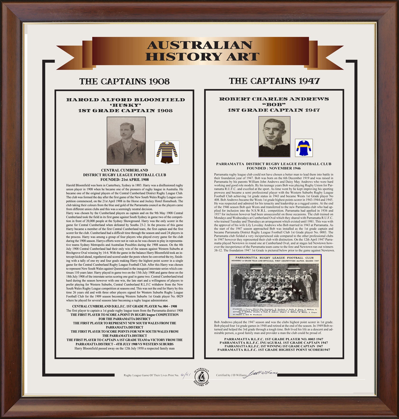 Experience the dynamic legacy of rugby league with our exclusive artwork featuring Bloomfield and Andrews, two iconic rugby league captains immortalized on frame. Meticulously crafted by Australian History Art founder Jeff Williams, this captivating piece brings to life the essence of their leadership and the spirit of the game.