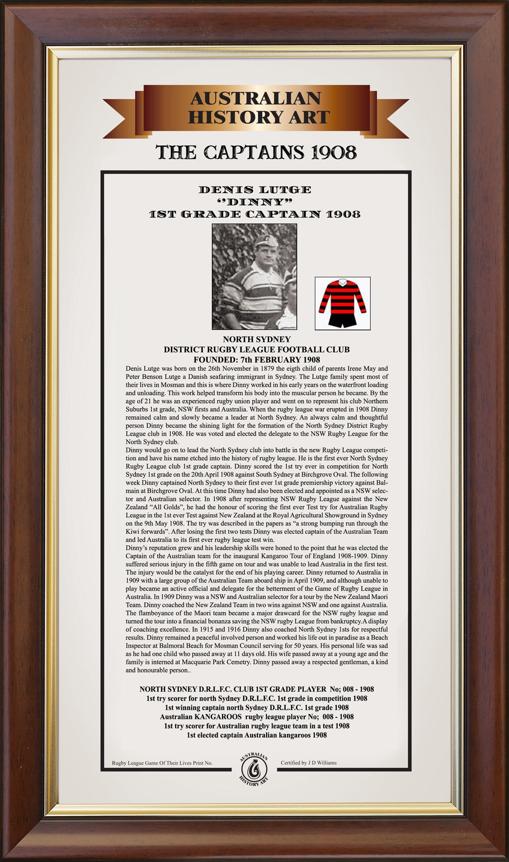 Dinny Lutge was a tough and uncompromising forward who led North Sydney into battle in 1908. Dinny was respected throughout the sport for his opinion and his sporting performances. He was one of the first men chosen for the inaugural Kangaroo team to play Great Britain in 1908-1909 on tour. An honor to hang this print in any place or in any company.