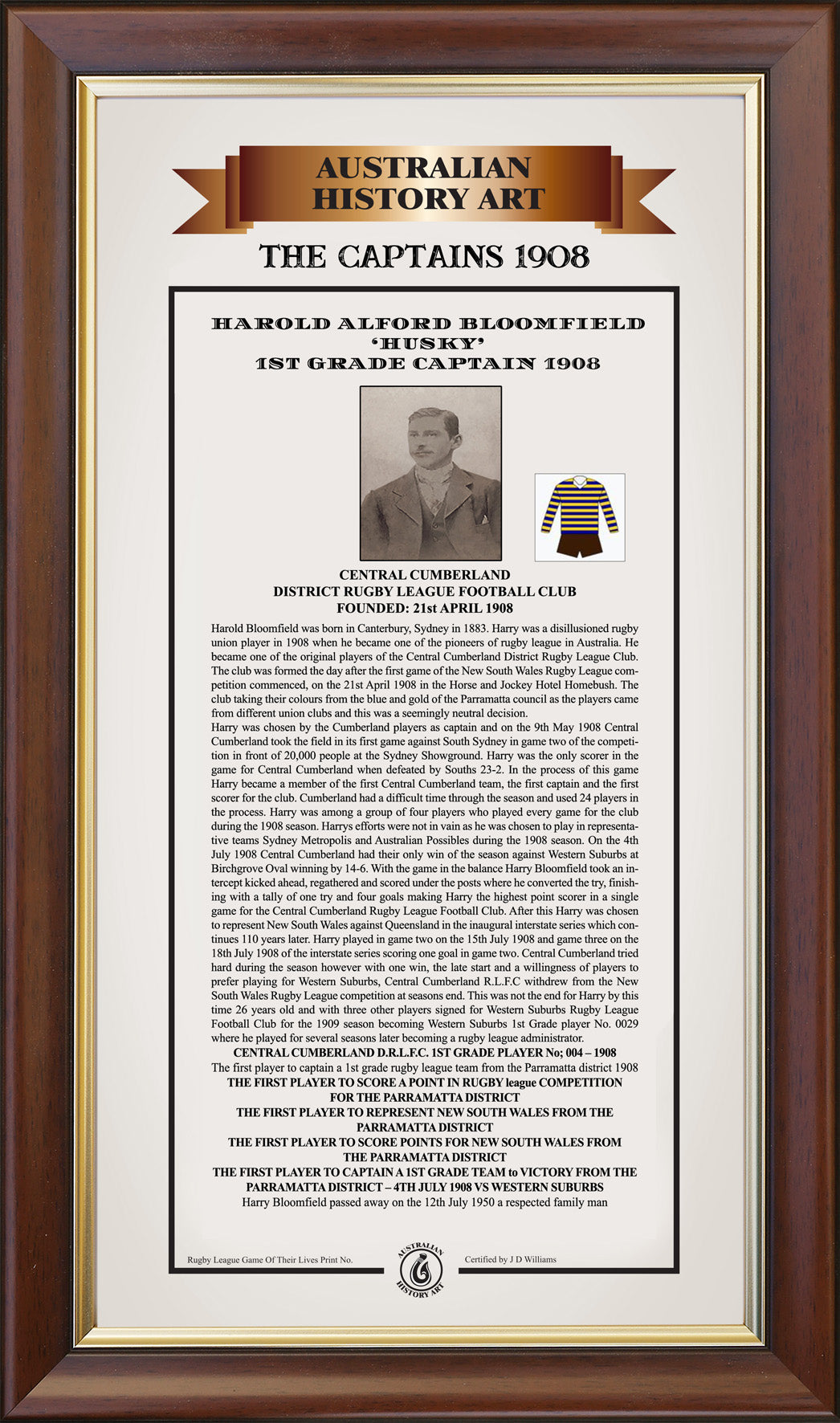 Harry Bloomfield is almost unknown in Australian sporting history; however, he is the first man to captain Rugby League from the Parramatta District, Cumberland, even taking the team colors from Parramatta Council. Harry scored the first try, kicked the first goal, represented NSW, and scored for NSW against Queensland in 1908. The image of Harry is the only one available in Australia, held by Australian History Art. This print is unique and will increase in value. The print is in limited numbers, with only 51 copies available for purchase. Harry played strongly and represented with determination and honor.