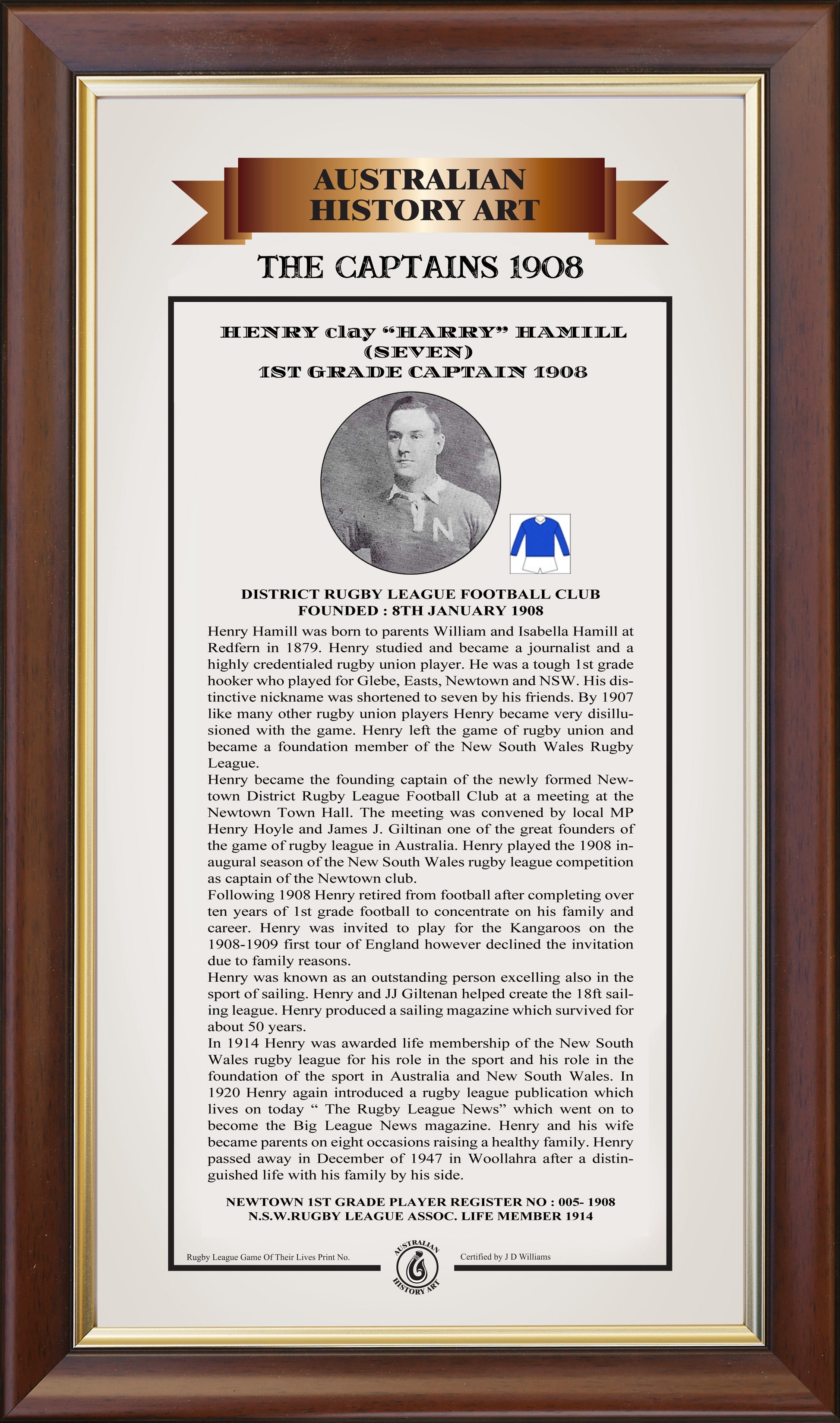 Immerse yourself in the timeless legacy of rugby league with our framed artwork featuring the illustrious captain, Henry Hamill. Crafted with meticulous attention to detail by Australian History Art founder Jeff Williams, this exclusive piece captures the essence of Hamill's leadership and the indomitable spirit he brought to the game.