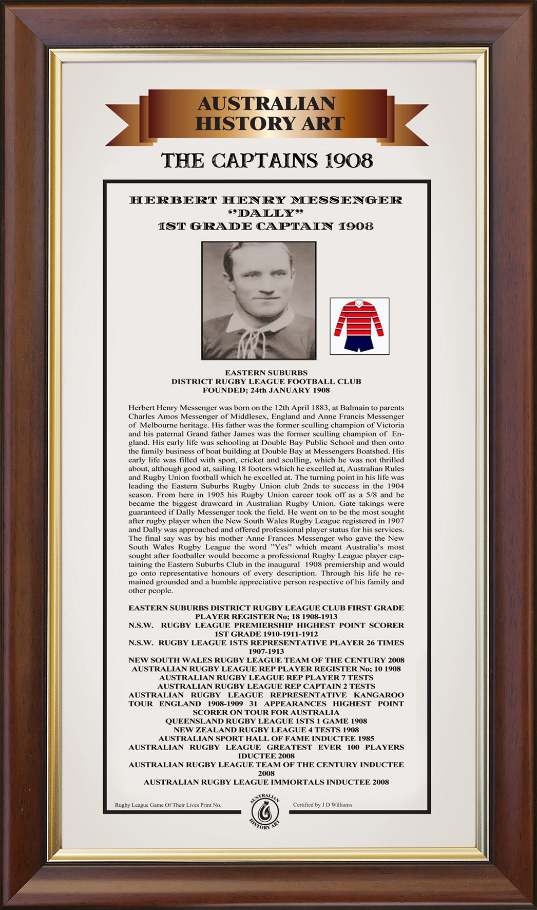 Dally Messenger is without doubt one of Australia’s most decorated and significant sporting champions. A man who led by example and was the ultimate competitor. A leader in the war of transition from rugby union to rugby league in Australia and then onto being a representative for Australia against Great Britain as an original Kangaroo in 1908. He was a great man who led by example and displayed all of the traits of