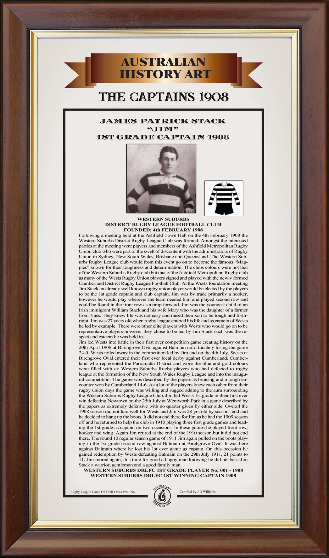 Jim Stack, who led Western Suburbs in its first year of competition, was a true leader and an accomplished rugby player who starred in Rugby League with fine performances. The son of an Irish immigrant and a hard, tough mother, Jim played hard, reflecting those values. Jim captained Wests to their first-ever 1st-grade victory, marking his place in history.
