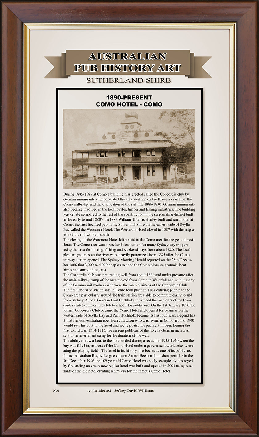 The original Como Hotel was destroyed by fire however the rebuild has maintained the iconic place in the Sutherland Shires history. Starting life as a club built by German rail workers, fisherman, timber getters, oyster farmers and tradesmen of all types the club struggled financially after the relocation of the rail workers in 1885 to Waterfall who worked on the Como rail bridge. Licensed in 1890 as a hotel it began its life as a meeting place for all and established itself as one of the Sutherland Shires most iconic hotels. Presented as a 29 x 51 cm piece, numbered, signed and with framing options for the buyer. Limited to 41 copies also available in a two pub set “Como Pubs” from Australian History Art.