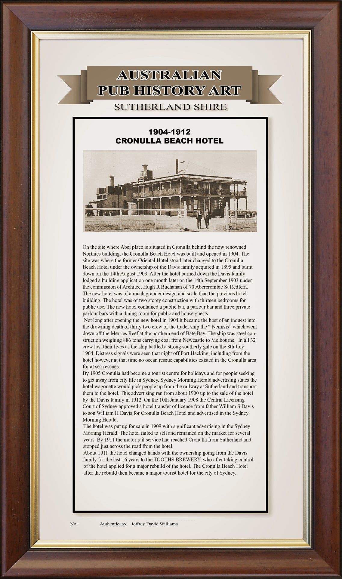 After the loss of the Oriental Hotel in 1904 due to fire the site in Cronulla was purchased and a new modern brick hotel was built with modern amenities. The hotel traded well and was a sought after holiday destination by many. As the Cronulla township grew, the hotel became the centre of the town where all types of water people mixed with all types of visitors. Cronulla was serviced by horse and buggy at this time from Sutherland railway station taking about an hour for the journey. In 1911 a steam tram service was put in place between Sutherland and Cronulla therefore increasing the property value of the hotel significantly. The steam tram ran between 1911 and 1931 and was replaced by double decker buses. The hotel was old in 1912 and purchased by a brewery. This piece of history is sized at 29 x 51 cm, numbered, signed, authenticated and limited to 41 copies. This print is also available in a Cronulla Pubs set from Australian History Art.