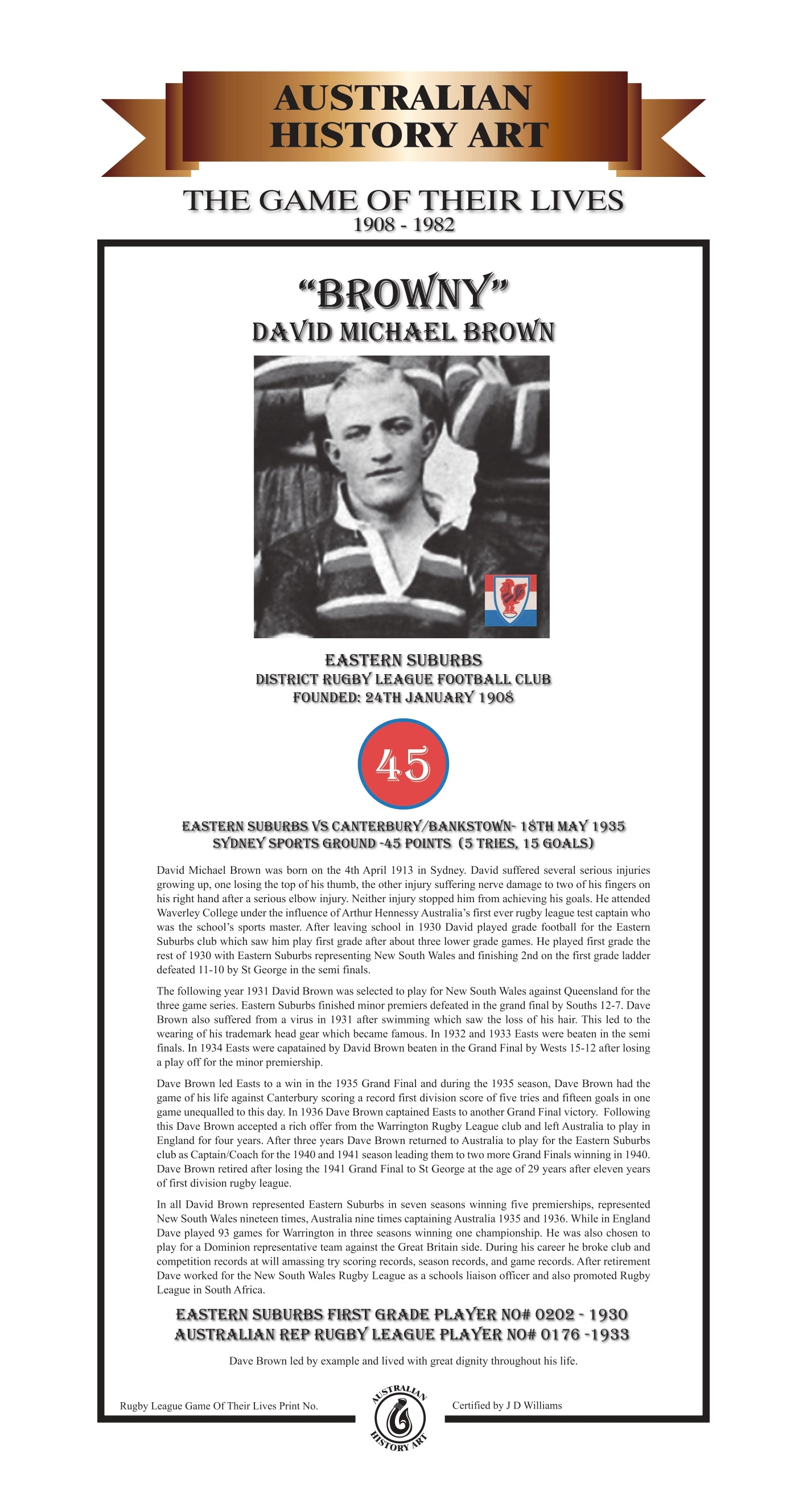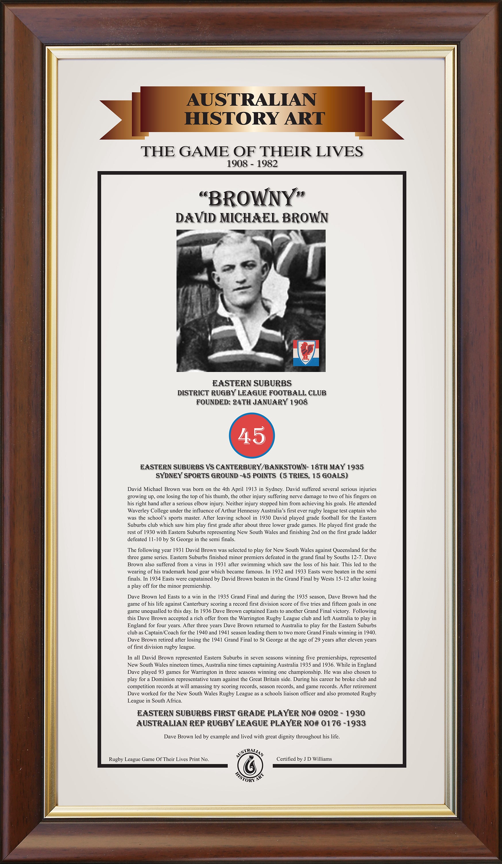 When the Eastern Suburbs Rugby League club of Sydney was at the top of its game in 1935, they were sweeping all before them, and Dave Brown, the captain, was the standout player. Every game during his career, he played to his best possible level. Dave was well-educated, a model citizen, and a great leader. Dave represented Australia, NSW, and his club with honor throughout his career. In 1935, Dave scored a record that will most likely never be equaled or broken in 1st division rugby league in Australia. One of the greats of Australian rugby league, an adornment for any wall space, whether at home, in the office, or at the club.