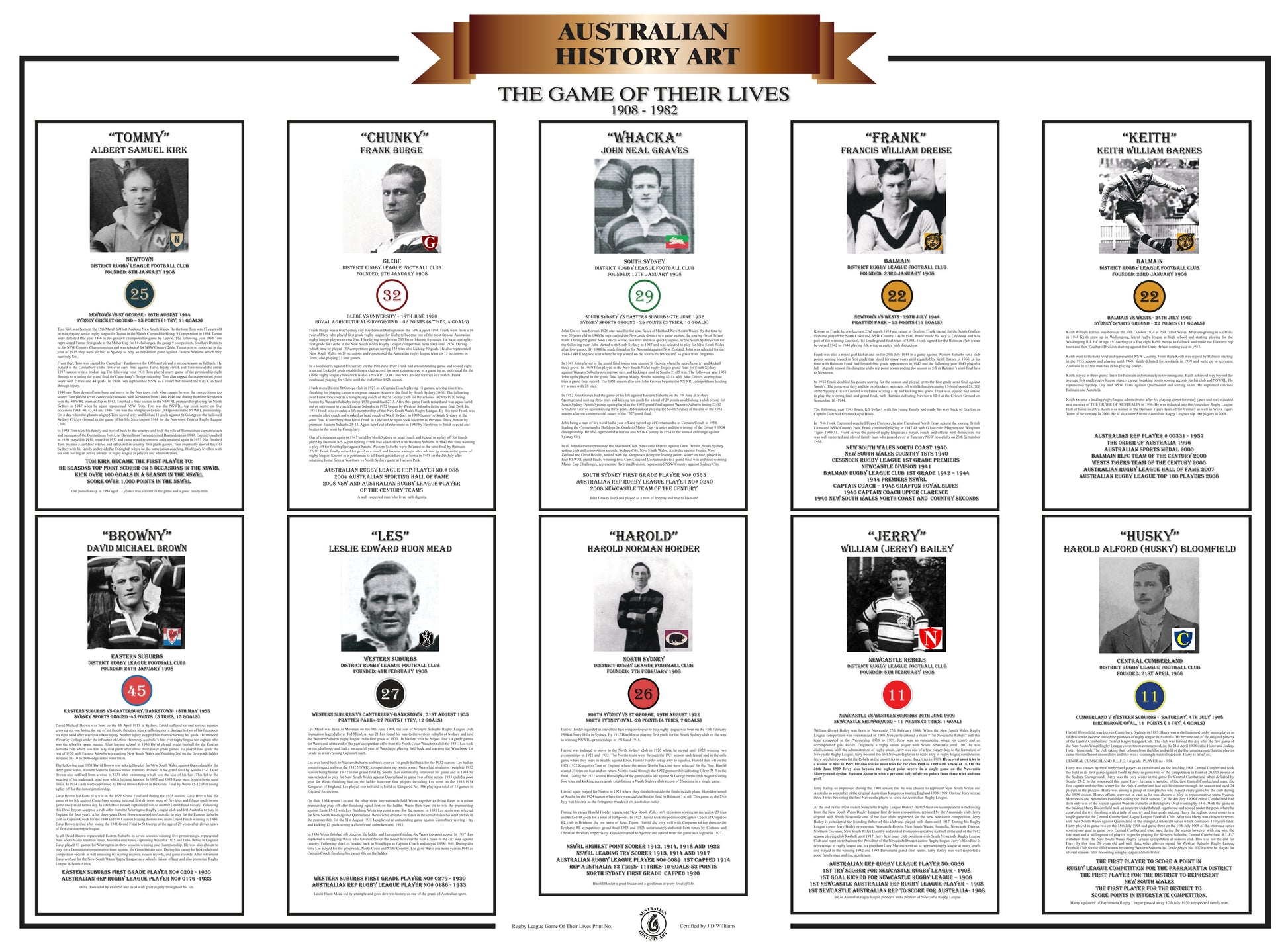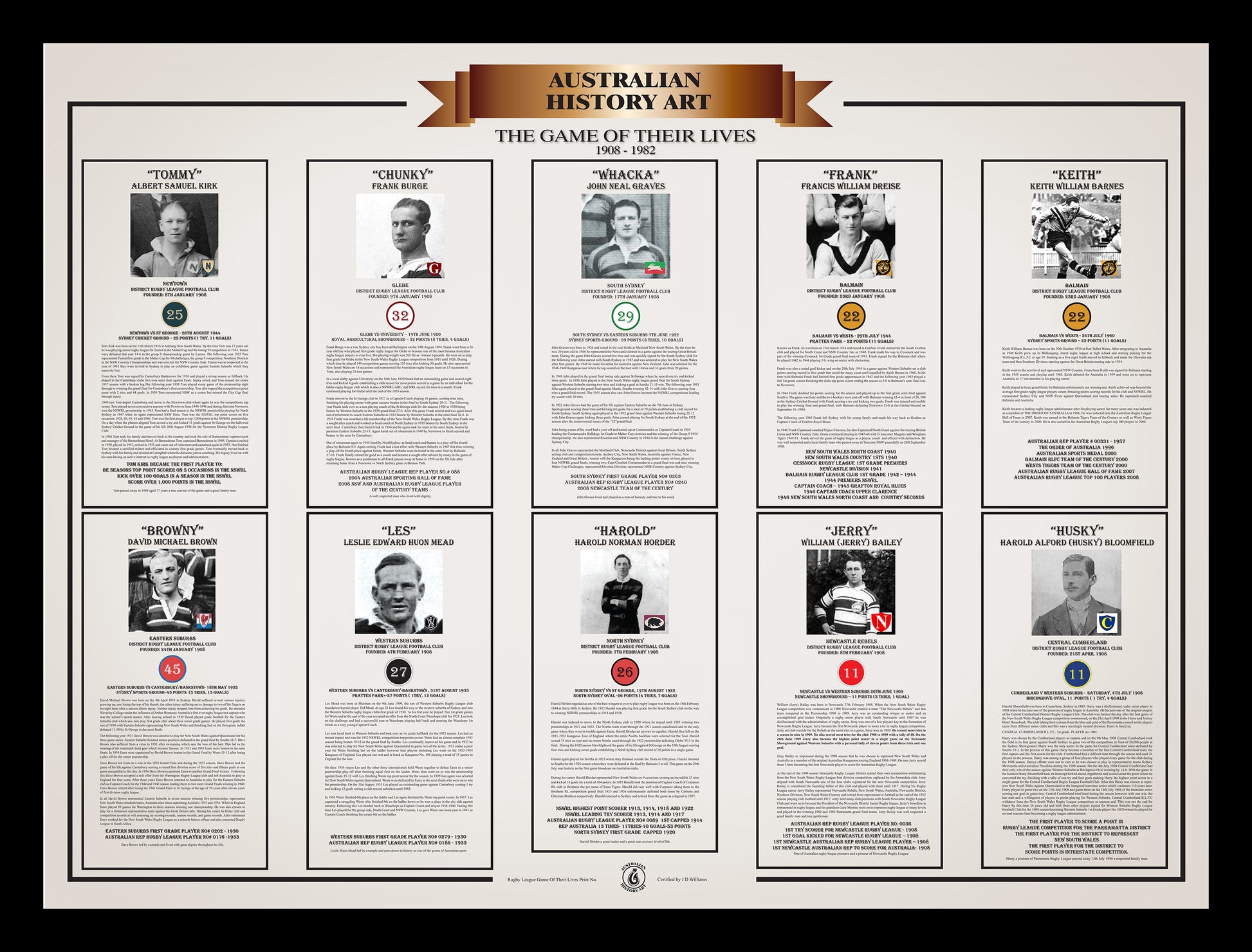 "The Game of Their Lives" print is dedicated to the outstanding men of the foundation rugby league clubs of Australia. Every rugby league player dreams of having the game of their lives, and these men did. This print is dedicated to the highest point scorer in a single game in the history of their club in the three-point try period. It features ten of the best players to grace the ovals of the sport of Australian Rugby League.
