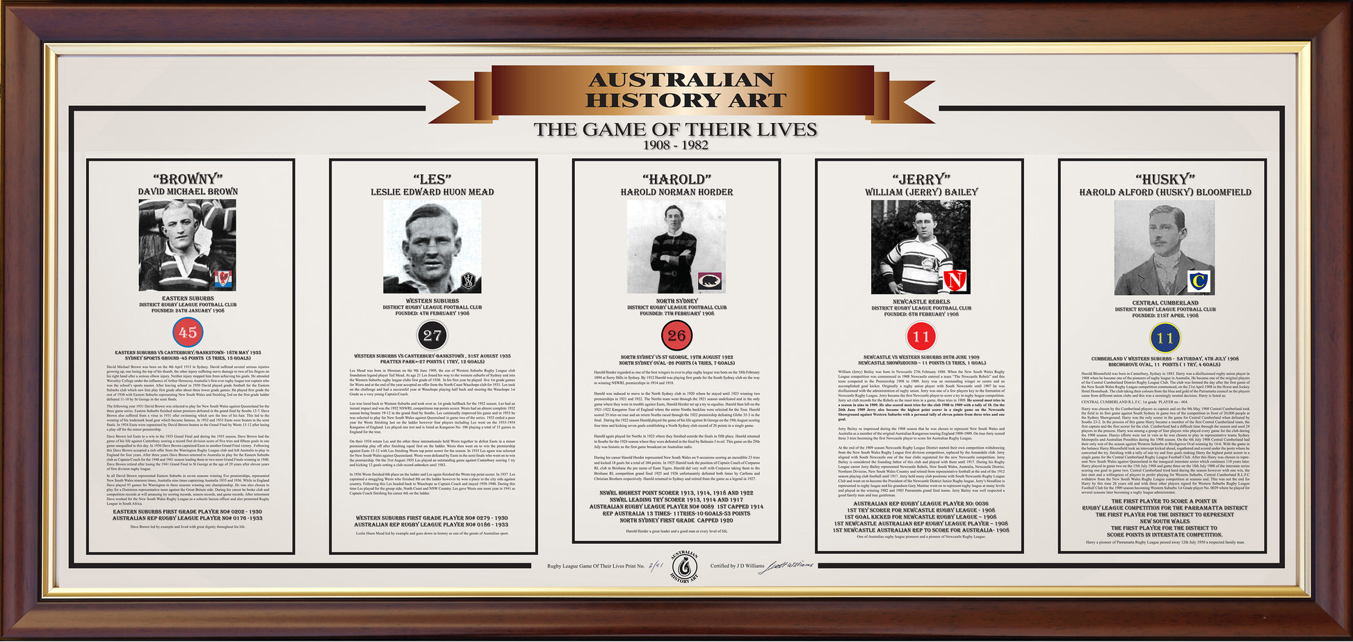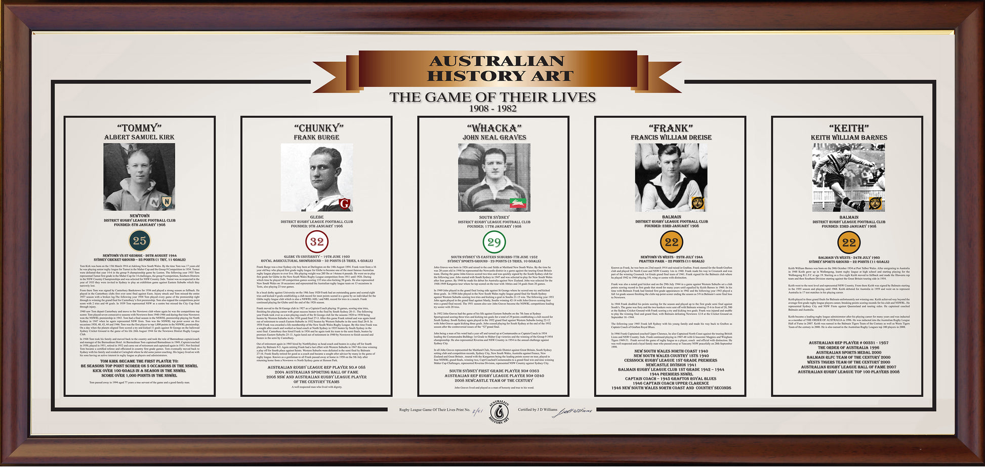 "The Game of Their Lives" print is dedicated to the outstanding men of the foundation rugby league clubs of Australia. Every rugby league player dreams of having the game of their lives, and these men did. This print is dedicated to the highest point scorer in a single game in the history of their club in the three-point try period. It showcases ten of the best players to grace the ovals of the sport of Australian Rugby League.