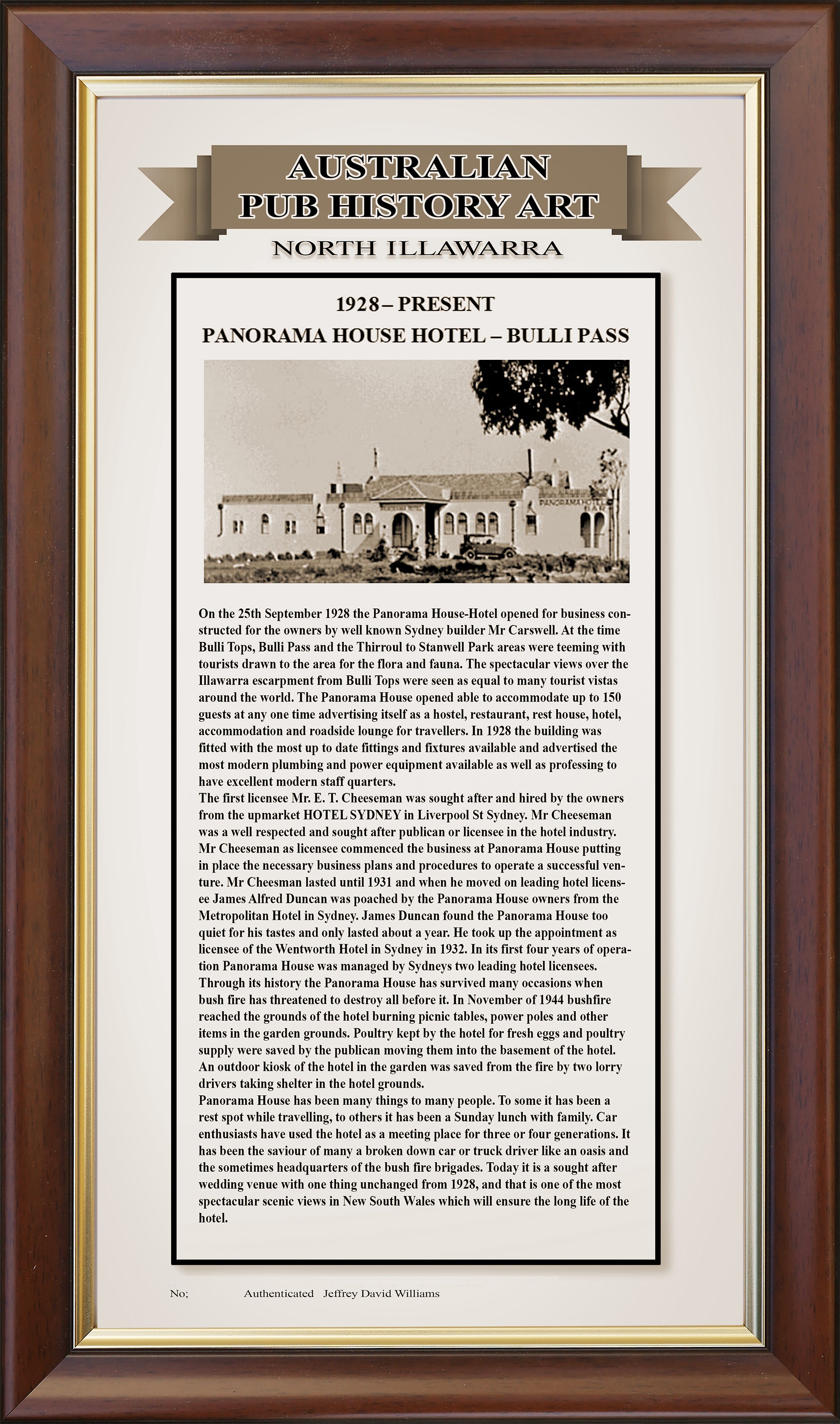 Passed by thousands of cars everyday with one of the best views in Australia. The Panorama is a true piece of North Illawarra history. The print is in limited numbers with only 51 copies available for purchase. Panorama Hotel Artwork is the perfect way to appreciate the beauty of North Illawarra from the comfort of your own home. A limited edition piece, with only 51 prints available, is the ideal way to add some unique culture to your collection. The 29x51 frame size allows for easy and impressive display.