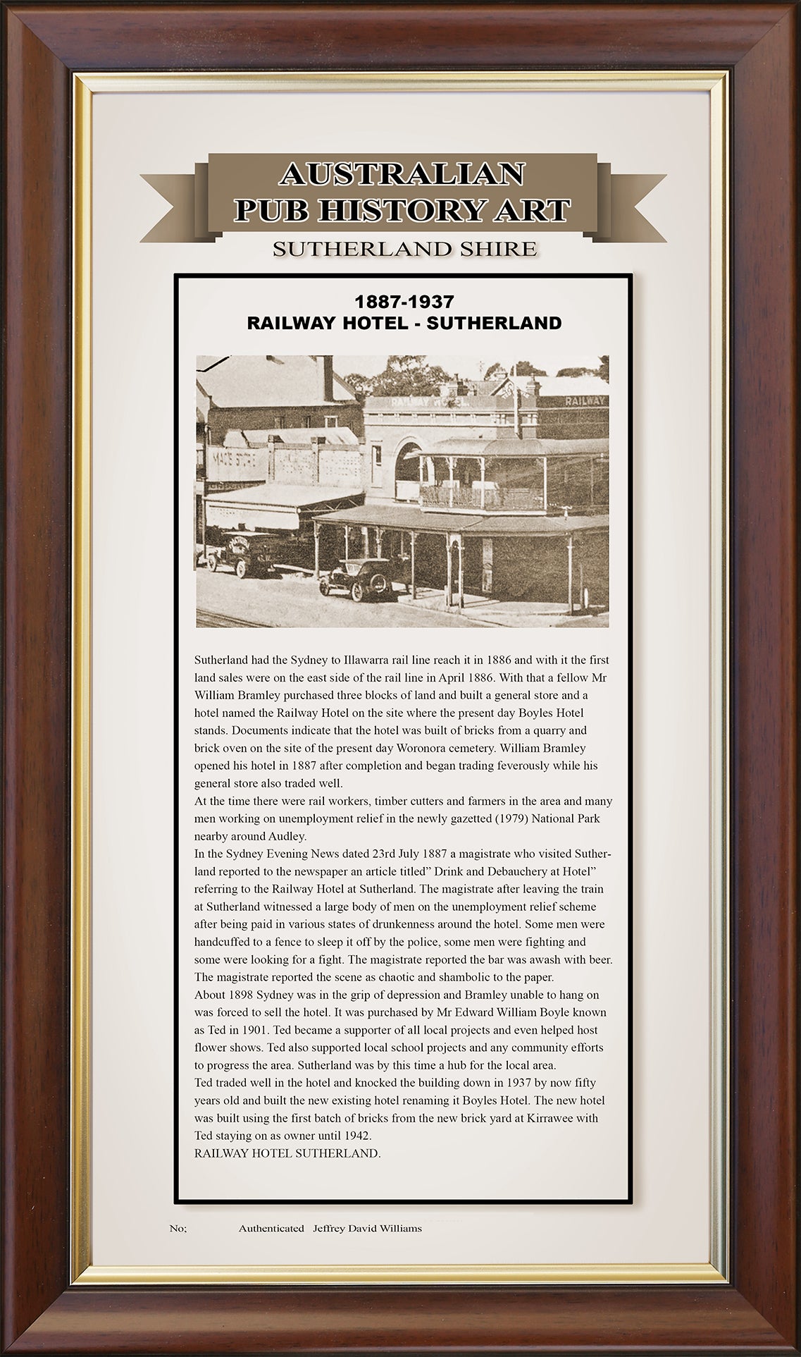 Built on the site of the present day Boyles Hotel at Sutherland it was the hub and centre of all things in Sutherlands early days. Many stories and tales eventuated from this hotel which opened in 1887. Strongly connected to the Railway and having the steam tram to Cronulla outside the hotel it was a meeting place, information hub and a strong supporter of local sports and organisations. Replaced in 1938 by the present day Boyles Hotel the ghosts of the Railway Hotel still reside in the shadows. A piece of Sutherland Shire history not presented in this form anywhere else limited to 41 copies, numbered and signed. Sized at 29 x 51 cm with framing choices for the buyer the print is also available in a three print set of Sutherland Hotels from Australian History Art.