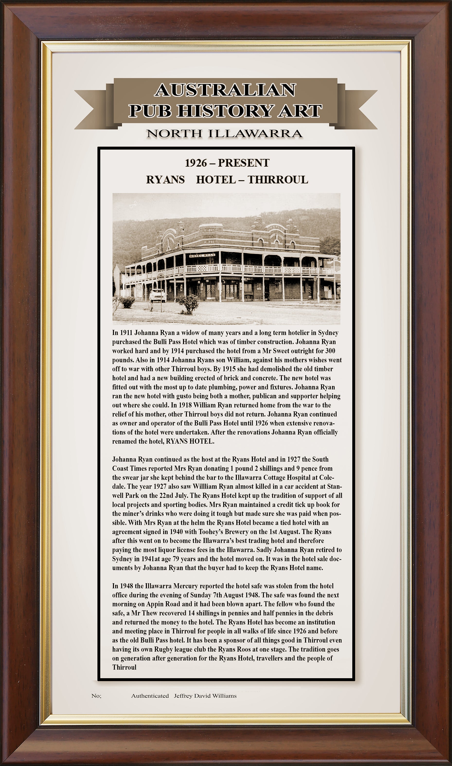 An icon of the Illawarra. The development and history of the Ryans Hotel artwork. The print is in limited numbers with only 51 copies available for purchase. This collectible artwork showcases a unique icon from the Illawarra region with a historical narrative of the development of Ryans Hotel artwork. Each print is a limited edition of just 51 copies, offering an exclusive opportunity for lasting memories. Frame Size: 29 x 51.