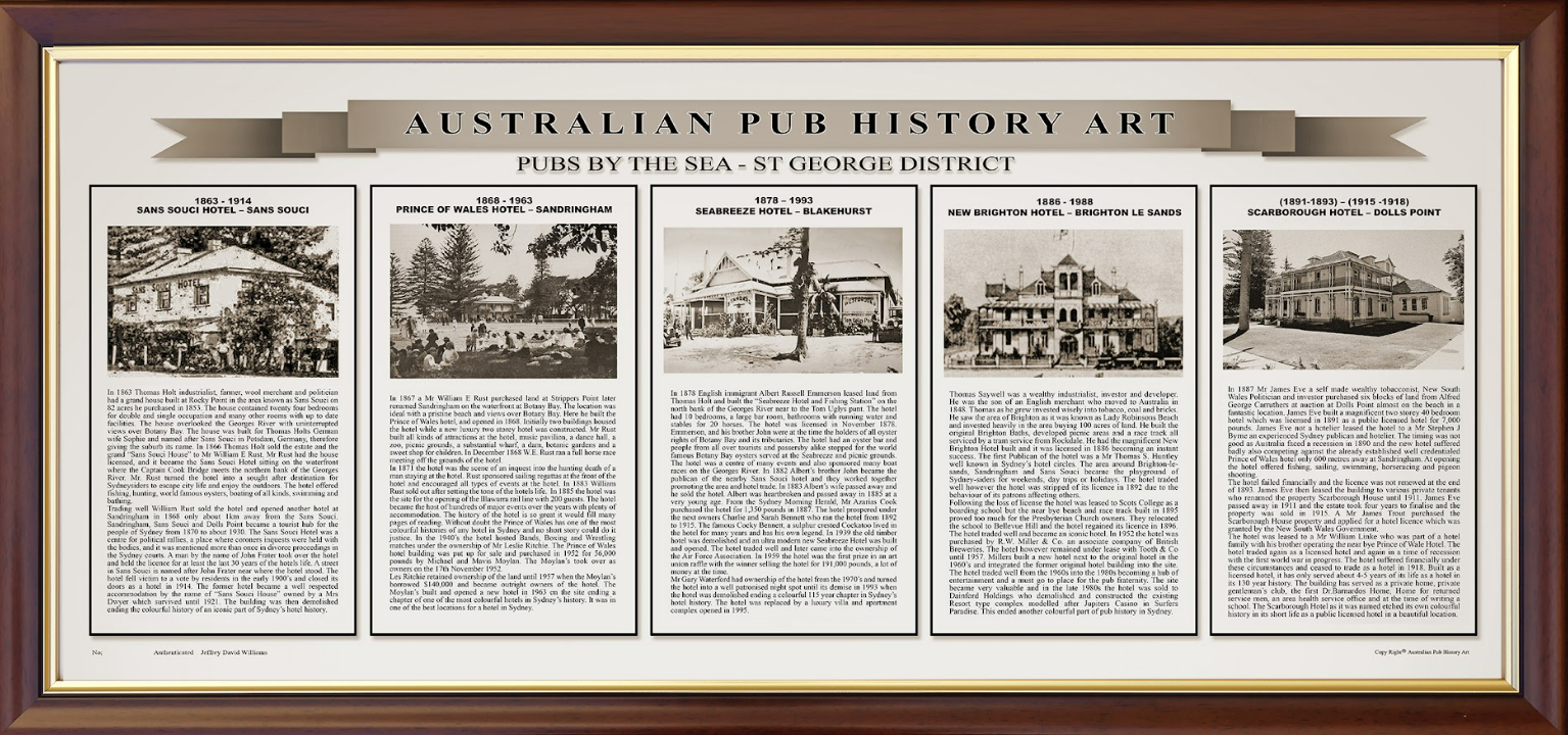 The colourful history of the early hotel industry around the Georges river and botany bay. The print is in limited numbers with only 41 copies available for purchase. This unique art piece captures the vibrant history of the area, printed in a limited edition of just 41 copies. A stunning 5-pubs print to bring an authentic feel to your home.