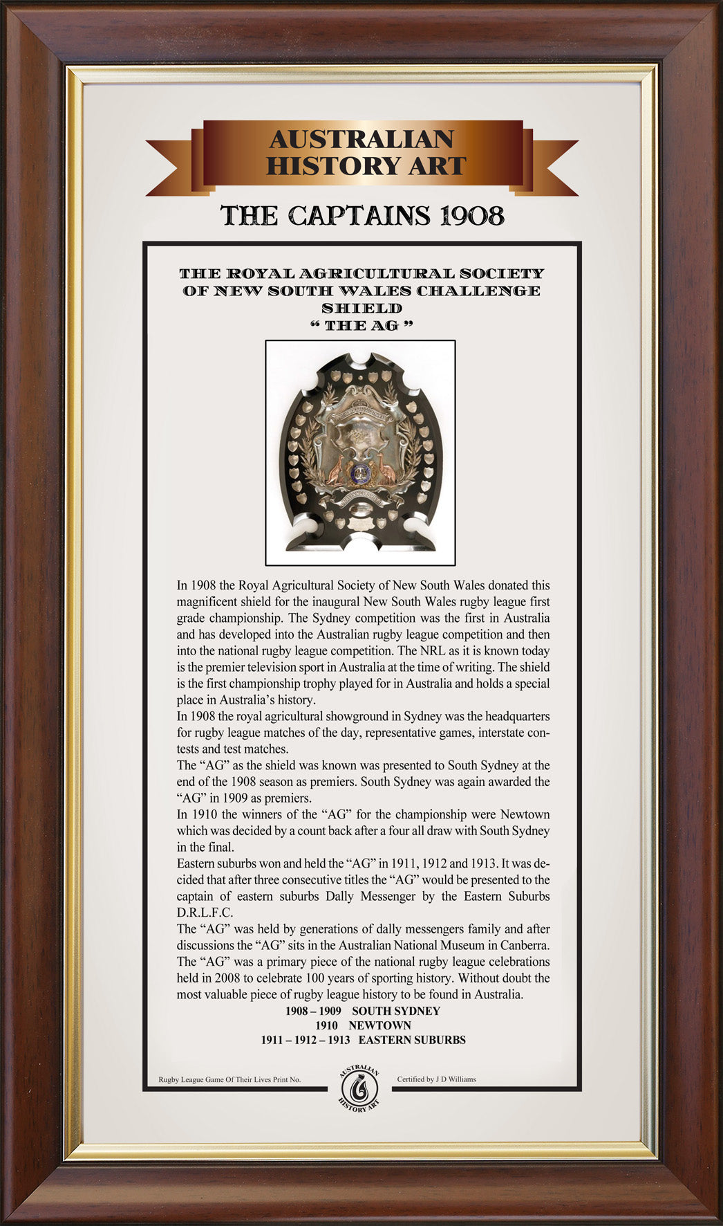 The most important trophy in Australian Rugby League is the Royal Agricultural Society of New South Wales' gift to rugby league in its foundation year in 1908. Kept in the National Museum in Canberra and known as the "AG," the AG has lived its own life and is a symbol of strength and solidarity. This is a collector's and rugby league supporters' piece of history to be treasured.