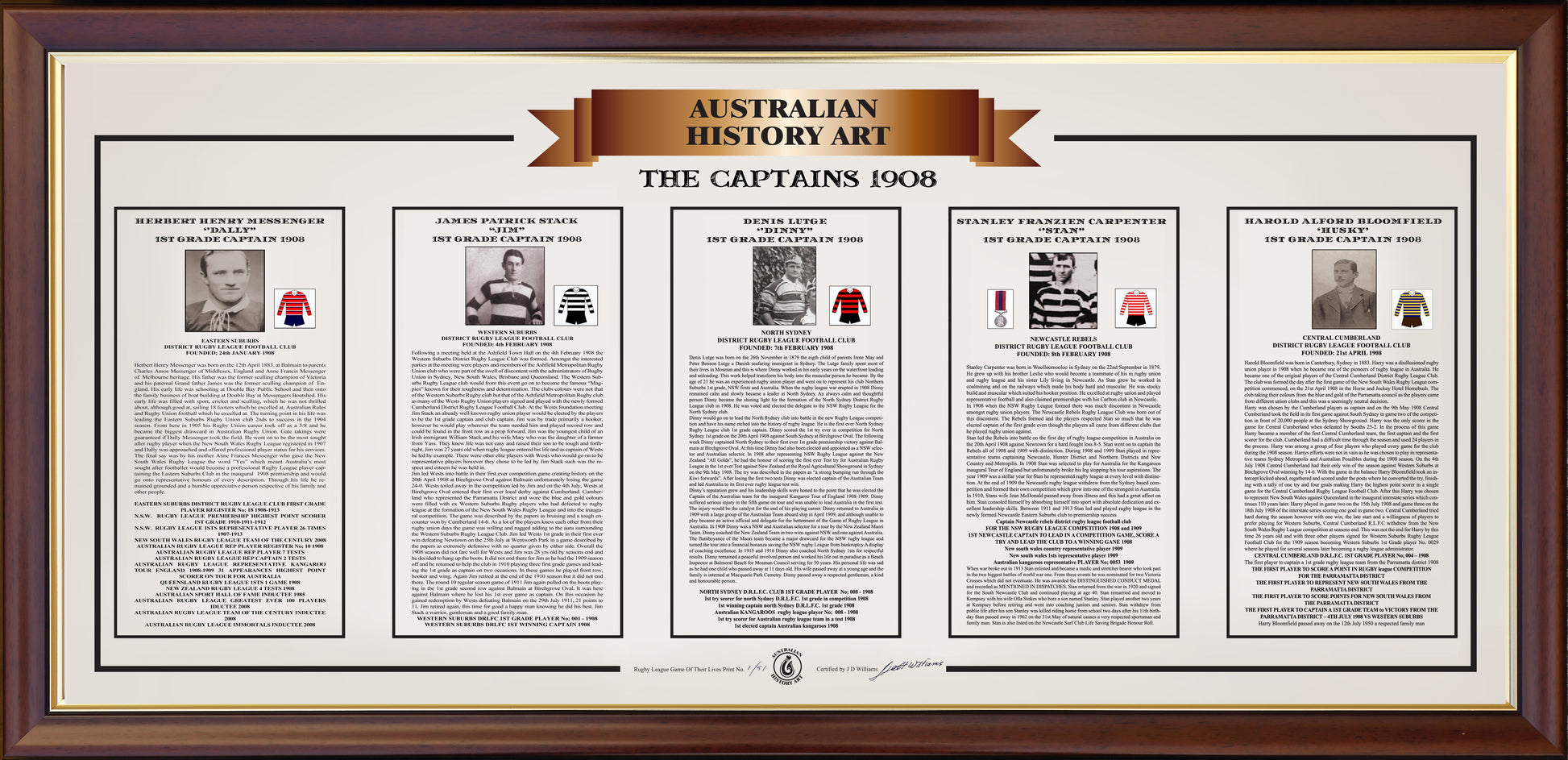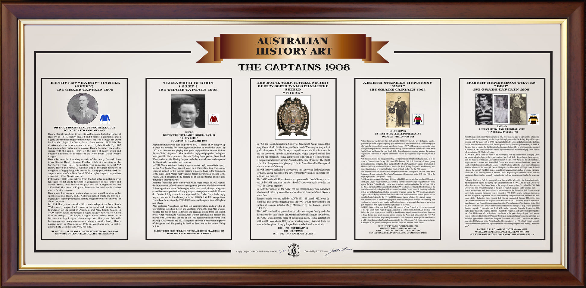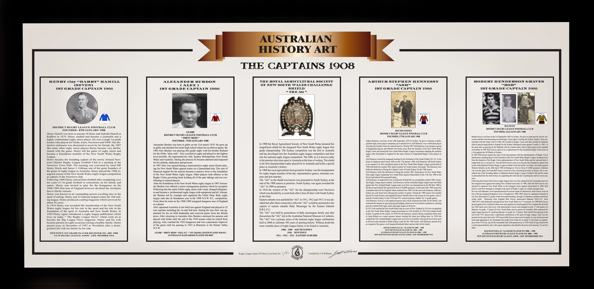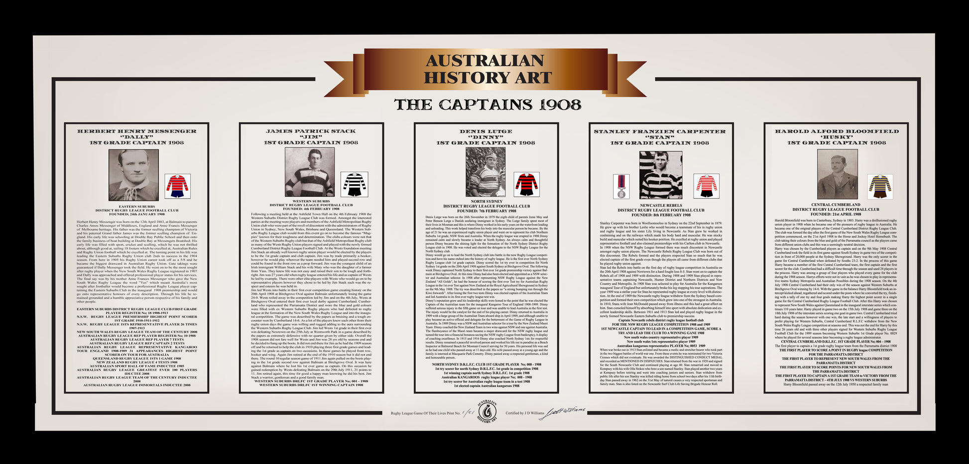 The most significant piece of Australian Rugby League history available. The game of rugby league was led by these nine men in 1908 at personal cost. They lived with threats and pressed on leading the birth of rugby league in Australia. This product depicts the strength and fortitude of these men and enforces the effort of the foundation clubs. There are two men almost unknown to the rugby league world and contains the only known photograph of Harry Bloomfield the captain of Cumberland in Australia held by