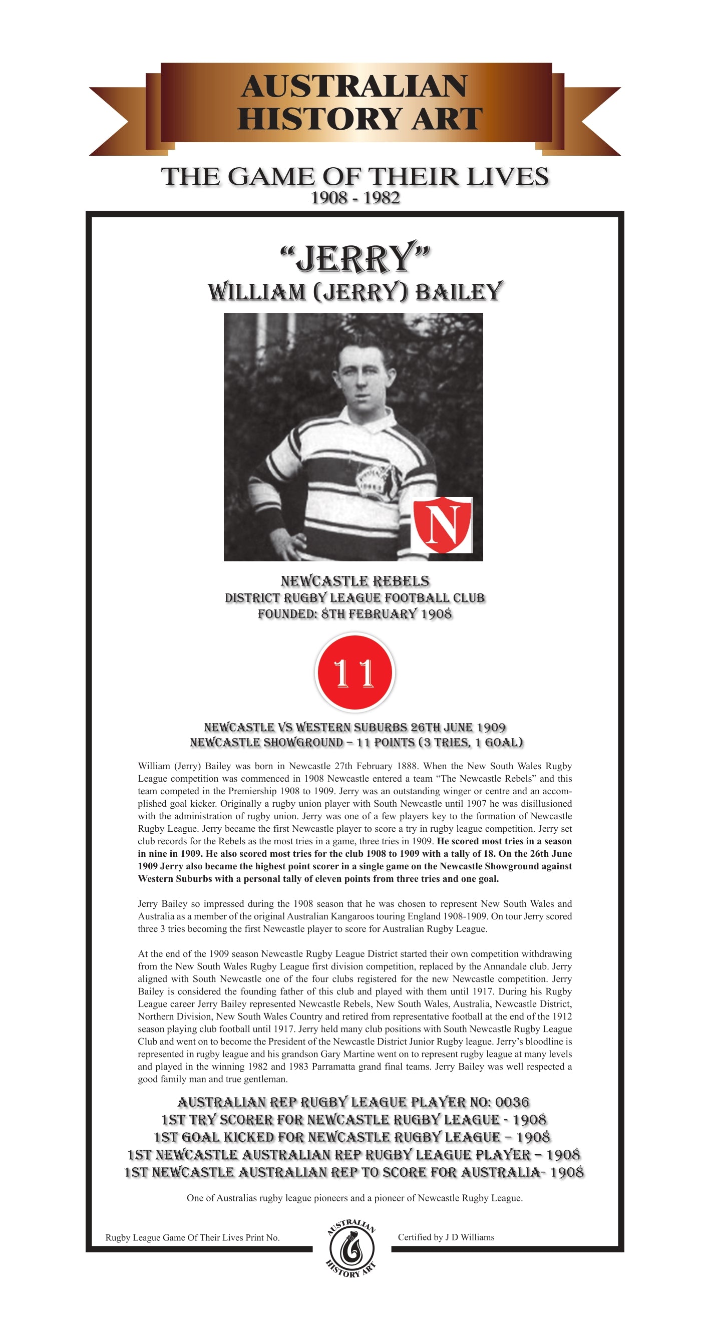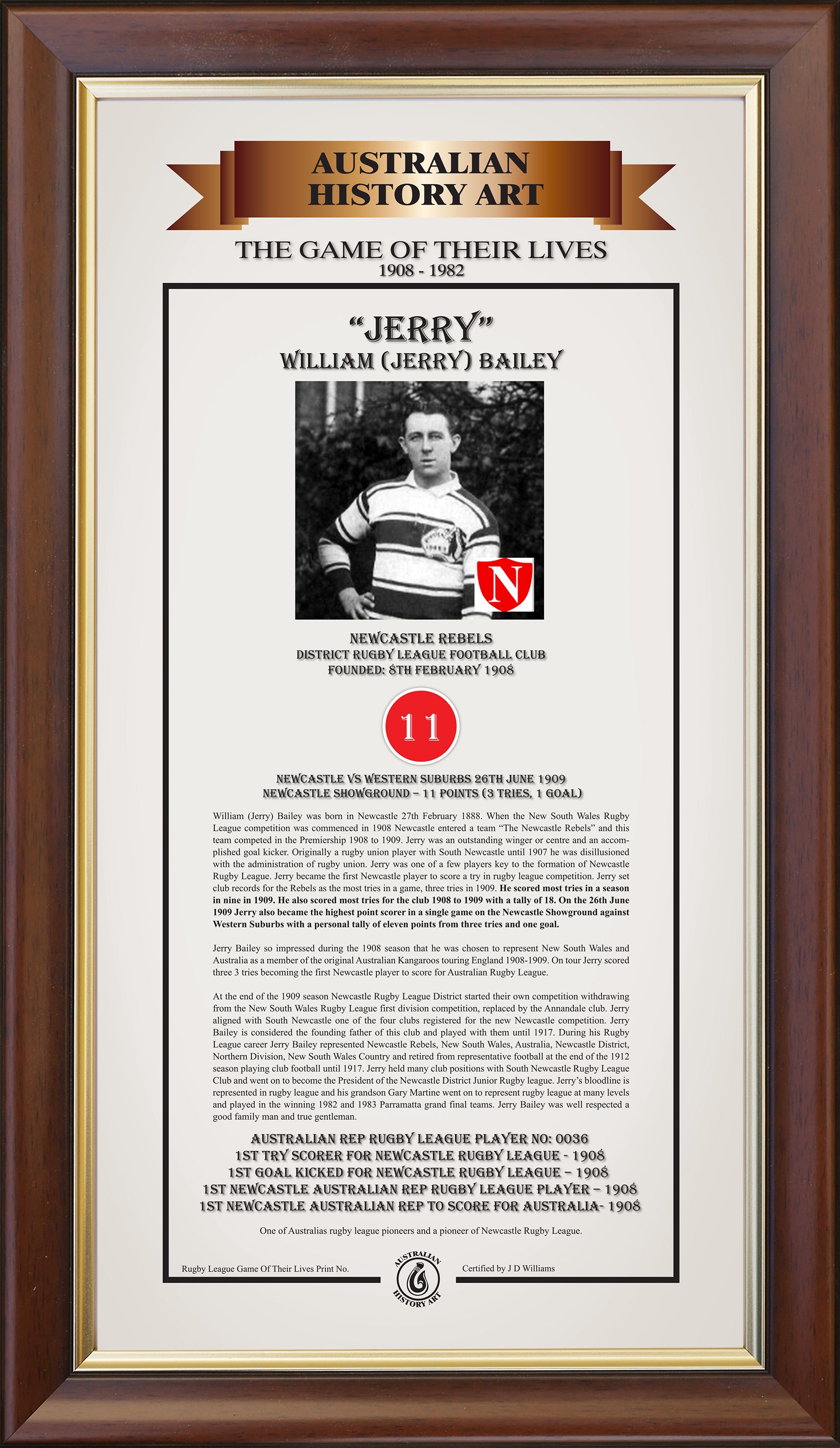 The Newcastle Rebels came into the NSWRL competition in 1908 with not much expectation. They had the disadvantage of travel every second week to Sydney although minimised by the game locations. One man stood out in the Newcastle team every week with great performances and toughness to inspire his fellow players. Jerry Bailey scored a single game high club record of points for the club in his time with the Rebels. Regarded as one of the fathers of Newcastle rugby league Jerry Bailey played representative football for Newcastle Rebels, Northern Division, NSW Country 1sts, NSW Firsts and Australia and was an inaugural Kangaroo to tour Great Britain in 1908. A true champion, honest, strong and a great leader.