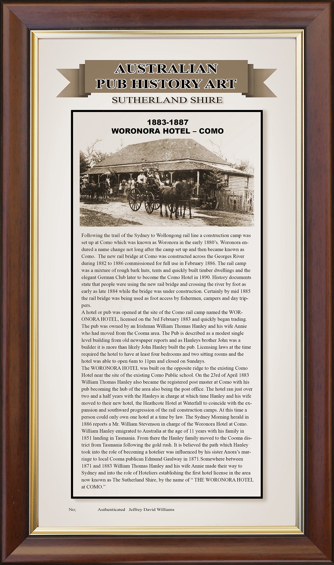 In 1883 William Hanley an Irish immigrant opened the 1st licensed hotel in the Sutherland Shire with his wife Annie. The “Woronora Hotel” at Como was near the construction of the Como Rail Bridge. The hotel has a short and colorful history with a built in customer base from the bridge workers. William Hanley was also able to get himself ordained as the post master for Como at the hotel. This product is not available anywhere else and has sales by pre order upon release. Limited to 41 copies not expected to last long. Sized at 29 x 51 cm with framing choices for the owner’s requirements, also numbered, signed and authenticated by Australian History Art.