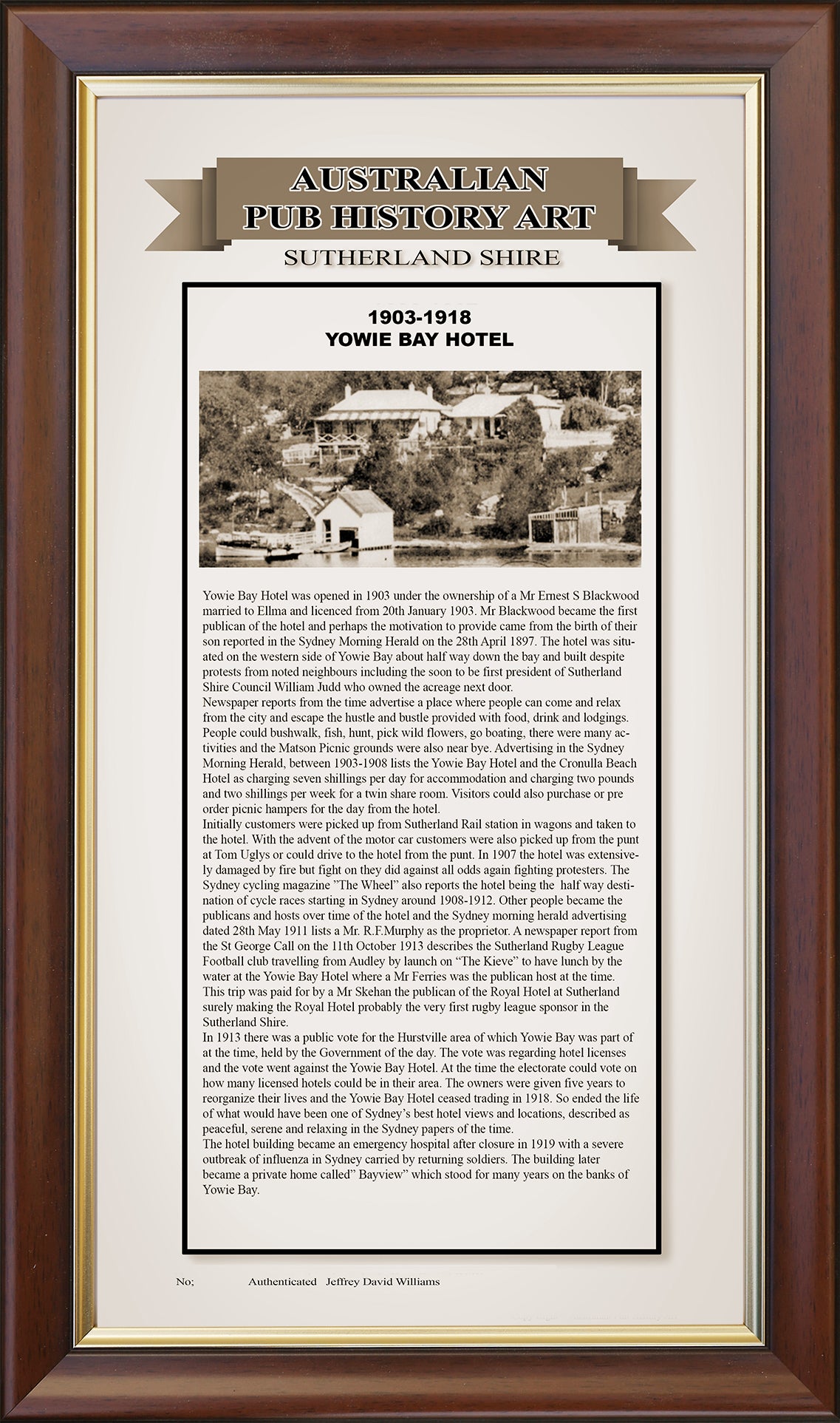 Opened in 1903 the Yowie Bay Hotel had a short but colorful history in one of the most beautiful places in the Sutherland Shire. Used as destination for push bike racers from Sydney, sailing events, boating activities of all kinds, holiday stays and day trippers. Locals mixed with the visitors and life was good at the Yowie Bay Hotel. Sadly closed as a hotel in 1918 the hotel served as a hospital for some time after the end of the first world war. This was due to the Spanish Flu Epidemic which ravaged the world. This piece is numbered, signed, authenticated and limited to 41 copies. Sized at 29 x 51 cm with framing choices for the buyer.